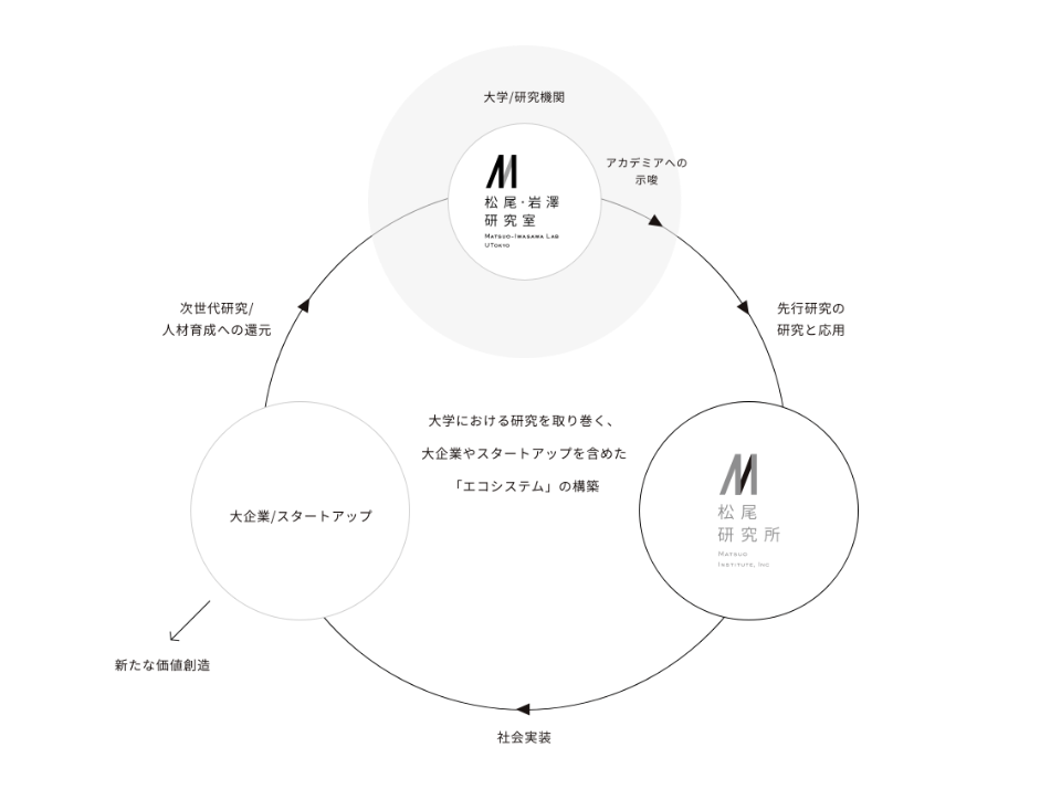 本研究室とビジョンを共有する株式会社松尾研究所 では、アカデミアから生み出される研究成果・技術の「開発・実装」を行い、広く社会に普及させることを目指し、日本の産業競争力の向上に貢献しています。松尾教授は技術顧問として参画しています。